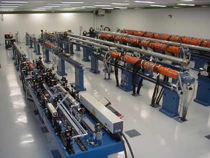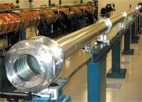 The Asterix IV/PALS laser chain includes besides preamplifier five power amplifiers. They boost the pulse supplied by the oscillator section up to an energy of one kilojoule. The size of the individual amplifiers gradually increases along the laser chain. The final amplifier is nearly 13 m long (see the picture) and provides the laser beam of 29 cm in diameter. A fraction of second before the laser shot, the amplifiers are energized by discharging the large capacitor banks placed in the underneath floor into the flashlamps that surround the amplifier’s tube containing the gas active medium. The intense flash of incoherent ultraviolet light produced by the flashlamps creates in the amplifier’s tube abundance of excited iodine atoms that are “ready” to add their extra energy to the laser pulse supplied by the oscillator section.