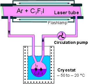 While the dimerisation products (perfluorohexane or perfluoro-2-methylpentane) are benign to the ability of the gas mixture to work as a laser medium anew, iodine molecules are both quenchers of the population inversion and make the mixture slightly corrosive. The gas mixture is therefore, after each laser shot, restored using cryogenic units. These units store the C3F7I liquid at a temperature providing the saturated vapour pressure at which the given laser module operates. The iodine molecules are captured in the cool alkyliodide liquid and thus removed from the gas mixture, while fresh C3F7I molecules are supplied to it.
