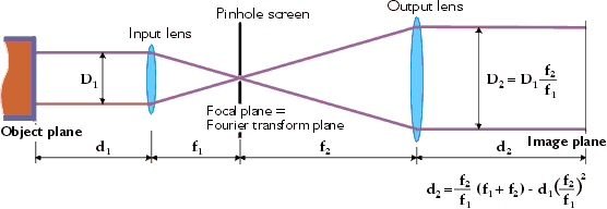 On its focal plane, the input lens produces a diffraction pattern which is a Fourier transform of the light distribution from the object plane. The diffraction pattern is constituted by the spatial frequency spectrum of the object, where a specific frequency is proportional to its distance from the axis of the system. Thus high spatial frequencies, corresponding to small-scale intensity modulations of the object, appear at a large distance from the axis. When a screen with a pinhole is inserted at the focal plane, these high spatial frequencies are eliminated. On the other hand, the low-frequency components constituting the smooth beam profile appear near the axis, and pass through the pinhole unperturbed. The output lens of the spatial filter performs the inverse Fourier transform, projecting the filtered diffraction pattern onto the image plane.