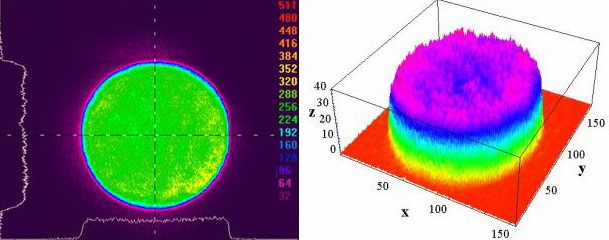 The Asterix IV/PALS laser is characteristic by a high spatial profile quality across the output beam. The below image shows a camera-recorded footprint of the output beam, and the vertical and horizontal line outs of this footprint.