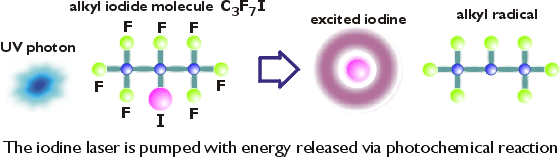 First, the efficiency of generation of the inverted iodine atoms from the parent alkyliodide molecules is fairly large – nearly 50 % – since fewer “adverse” secondary products are generated during the photolysis. This makes it possible to easily regenerate the lasing medium after each shot, allowing a low-cost operation of the system.
