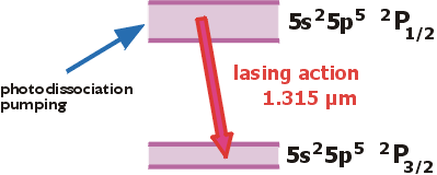 The lasing action occurs between fine-structure-split levels 2P1/2 and 2P3/2 of the fundamental configuration 5s25p5 of the neutral iodine atom. The electronic configuration of these two levels is described using a spectroscopic notation corresponding to so-called LS coupling which is applicable to atoms in which the spin-orbit interaction is small. The upper left index denotes the multiplicity of the electronic spin, the capital letter gives the orbital angular momentum, and the right lower index expresses the total value of the electronic angular momentum.