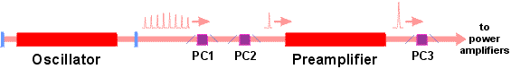 A shot of the laser system begins in the oscillator section, which produces the initial weak pulse of light that is then admitted to the chain of power amplifiers. The oscillator section consists of the master oscillator and of the preamplifier. The master oscillator generates a sequence of several nearly identical pulses.