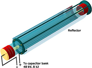The flashlamps energizing the amplifiers consist of quartz tubes and are filled by xenon. They are driven at 30 to 40 kV – depending on the desired laser output energy – through a discharge circuit resulting in white light pulses with maximum spectral intensity at 250-300 nm and duration of 2-10 μs. Yellow-green light near 500 nm also dissociates the iodine molecules I2 that spontaneously form in the active medium.