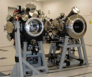 The second target chamber (on the left) is a 124 cm long cylinder, 65 cm in diameter. Similarly to the master chamber, it is equipped with a hinged door using a pneumatic lock. It may be vacuum coupled to the master chamber or operated independently. When vacuum coupled, the separation of the targets can be adjusted to range from 95 cm to about 5 meters, using different lengths of vacuum bellows and/or solid tubing. The distance rearrangement is eased by a guideway system integrated in the floor, in which the cylindrical chamber may be displaced. In addition to the beam entry and vacuum ports, there are 18 smaller ports on this chamber available for diagnostic instrumentation.