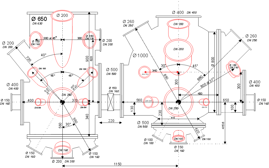 The master target chamber (on the right) consists of a spherical section 100 cm in diameter, equipped with a hinged, 80 cm diameter end cap that serves as the main entrance port. A pneumatic clamping mechanism is used to seal the system, allowing quick and unobstructed access to the chamber interior. Another entryway is provided by a 50 cm diameter port outfitted by a hinged door, located at the side opposite to the main beam insertion port. Fifteen circular ports of diameter ranging from 64 to 500 mm are further available for diagnostic and alignment purposes.